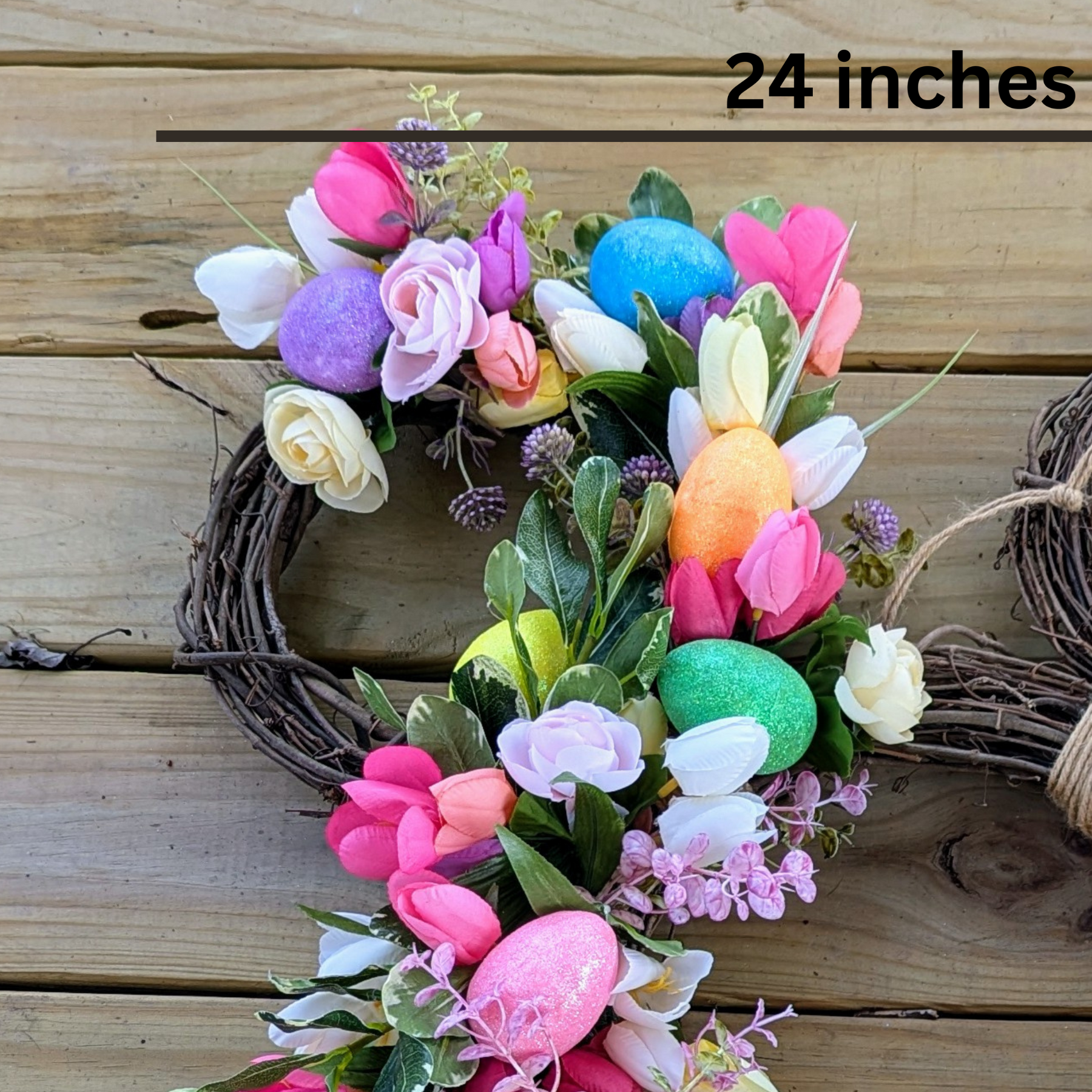 This Easter Mickey Wreath beautifully combines the playful spirit of Mickey with the festive colors of Easter. With yellow, purple, pink, and cream floral and Easter eggs carefully arranged on a cheerful wreath, this product brings joy to any home. Celebrate the holiday with this charming decoration. Large 24 inches, adds beautiful curb appeal to your home. Wreath has been treated with UV and weather protectant to last many years. Will get the most use if hung in protected area, under shelter from rain and direct sun.